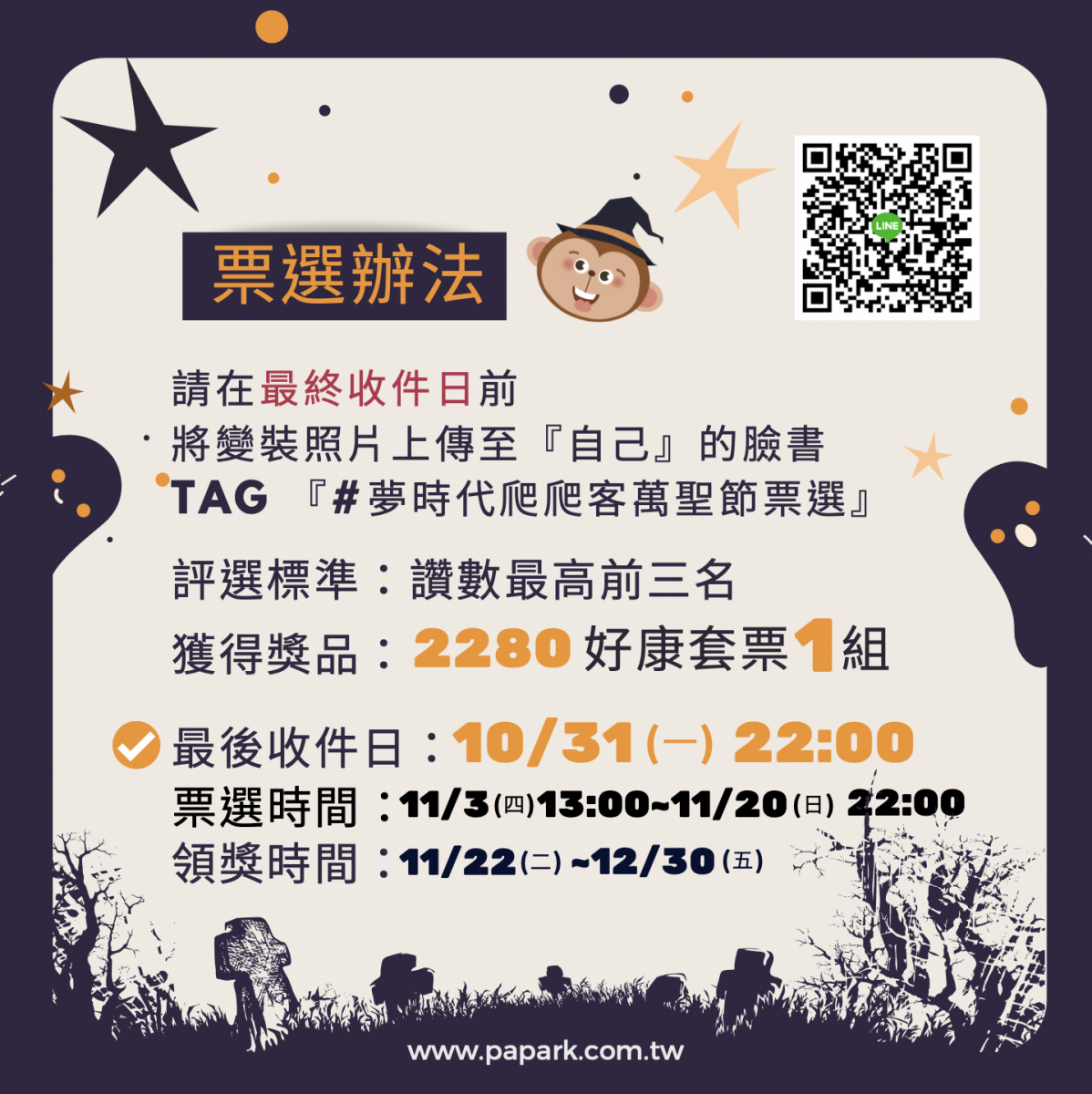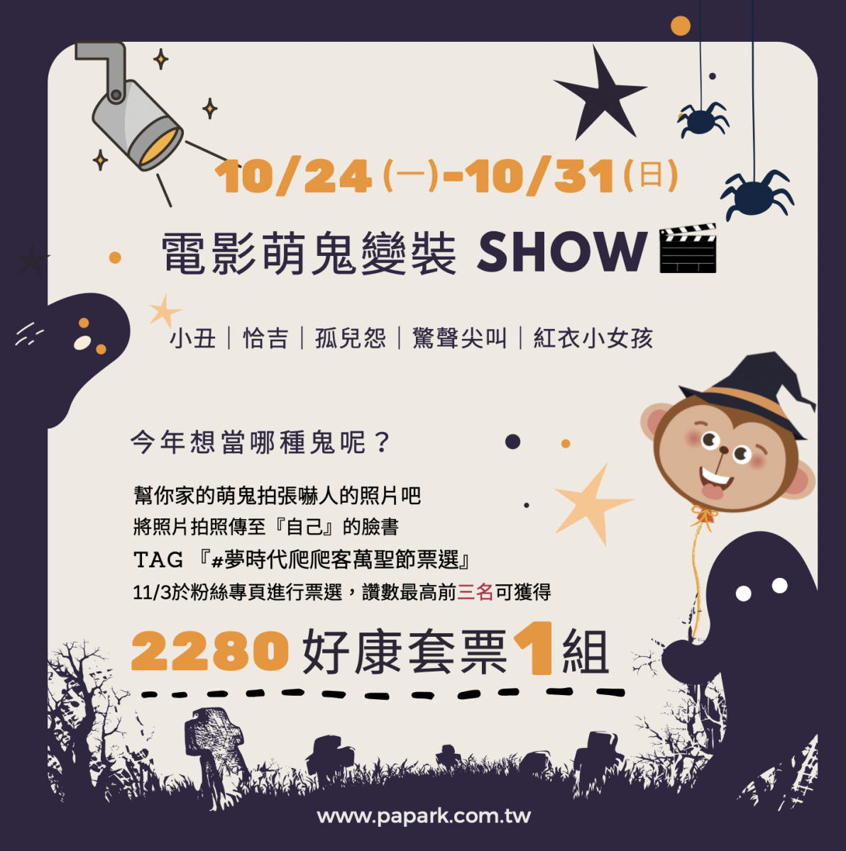 活動內容:於活動期間內孩童變裝,家長幫自己的孩童變裝後照片拍照上傳至『自己』的臉書,並打上通關密語『#夢時代爬爬客萬聖節票選』,本公司於11/2將統整上傳粉絲專頁進行票選,讚數最高前三名可獲得『2280套票1組』。